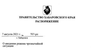 Врио губернатора края Михаил Дегтярев подписал распоряжение о введении режима чрезвычайной ситуации в границах Хабаровского, Амурского, Комсомольского, Нанайского, Николаевского и Ульчского районов, а также городов Хабаровска и Комсомольска-на-Амуре. Такое решение было принято в целях предупреждения надвигающегося паводка и консолидации сил для оперативной ликвидации его последствий.