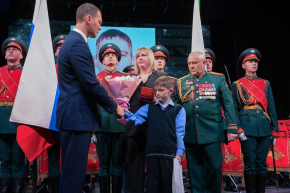 Сегодня в зале — родители, супруга и дети старшего лейтенанта Блинова. Для нас большая честь вручить Золотую звезду Героя его семье.