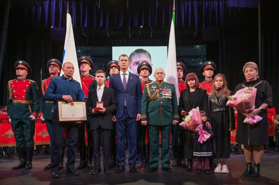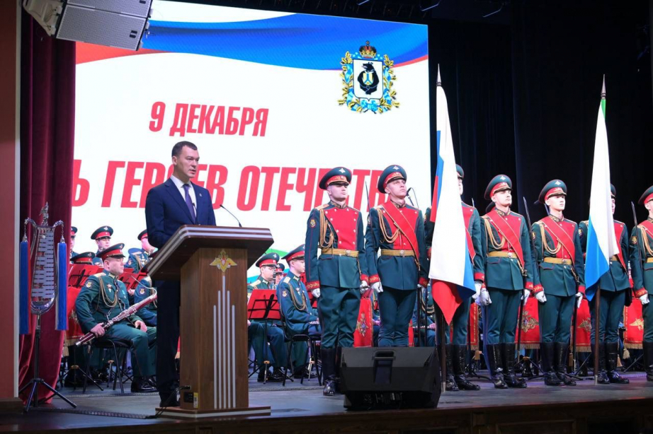 Сегодня, в День Героев Отечества, губернатор Хабаровского края Михаил Дегтярев и врио командующего войсками Восточного военного округа генерал-лейтенант Михаил Носулев в ходе торжественного собрания поздравили военнослужащих и их семьи, ветеранов боевых действий и службы, Героев России и наградил лучших из них.