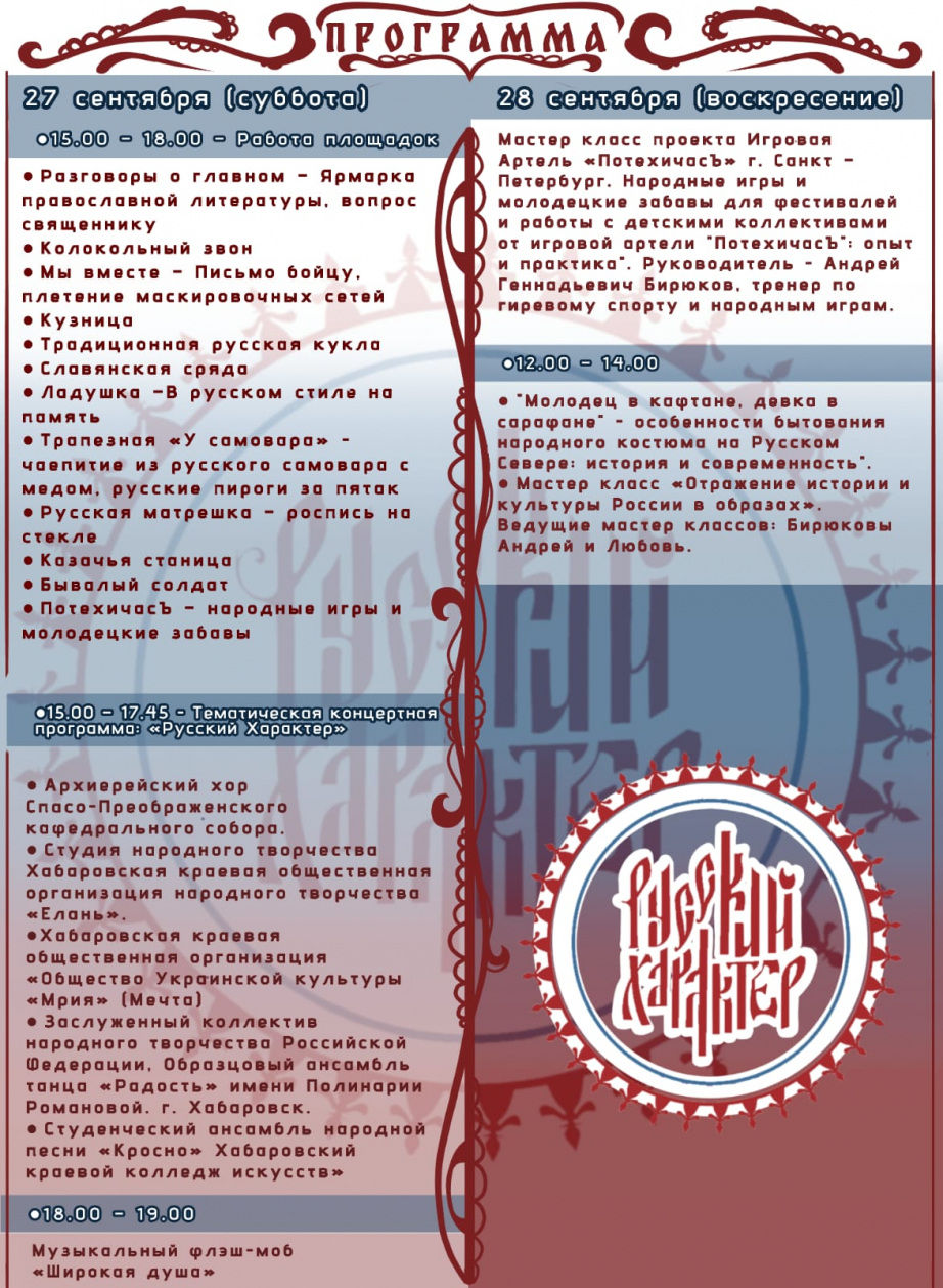27 сентября с 15.00 до 19.00 на стадионе им. Ленина (в районе колеса обозрения) участников акции ждет насыщенная программа: интерактивные площадки, выставка "Защита суверенитета российского государства. История и современность", мастер-классы мастеров декоративно-прикладного искусства и концерт от творческих коллективов Хабаровска.